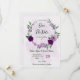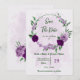 Beautiful romantic wedding save the date invitation featuring purple flowers and some green leaves .