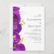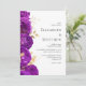 This romantic floral wedding invitation features a border of purple flowers set off with gold faux foil foliage. The names of the couple appear in classic charcoal grey serif font, with the remaining text in italics.