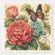 Red and blue flowers and a butterfly on a retro stamp.