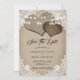Rustic country wedding save the date card featuring burlap hearts on a burlap background decorated with white floral lace and string lights.