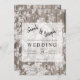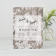 Romantic rustic wedding invitation, featuring a white romantic flower print on grey weathered wood planks.