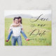 This romantic save the date postcard features a full photo and elegant script. On the front of the card, black modern calligraphy reads "Save our Date" and overlays a full-bleed, landscape-orientation photo. The couple's names, wedding date, and wedding location are written in black on the front of the postcard. The back of the save the date includes room to add additional wedding details (such as the wedding website).