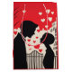 A visually striking artwork depicting a romantic scene featuring a silhouetted couple gazing at each other. The background showcases a vibrant red sky filled with floating white and red hearts, alongside stark black-and-white buildings and a bare tree, suggesting a city setting. The art style is bold, modern, and minimalistic, emphasizing love and connection between the two figures.