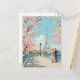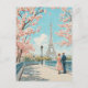 A beautifully illustrated 1950s-style travel poster depicting a romantic couple strolling beneath blooming cherry blossoms with the Eiffel Tower in the background. The pastel tones and retro aesthetic capture the timeless charm of springtime in Paris.