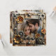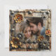 Cool and unique wedding wedding invitation. Steampunk themed with gold and silver metal gears, flowers and a weathered wood background. Upload your favourite picture in the personalize area and edit the text on the back to add your own wedding info.