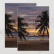 A breathtaking beach sunset scene featuring a golden and purple sky, calm ocean waves, and a black silhouette of a palm tree on the right. The warm hues reflect on the water, creating a romantic and serene atmosphere—perfect for a wedding invitation.