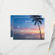 A breathtaking beach sunset scene featuring a golden and purple sky, calm ocean waves, and a black silhouette of a palm tree on the right. The warm hues reflect on the water, creating a romantic and serene atmosphere—perfect for a wedding invitation.