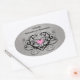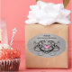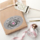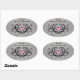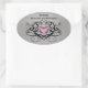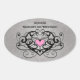 Oval labels with space for 2 names and a wedding date on it and a black swirly heart with a smaller heart inside in pink on a grey background on them.