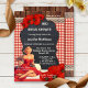 A romantic bridal shower invitation with a BBQ theme, featuring rustic wood, a blackboard, a vintage painting of a woman in a red dress, poppy flowers and lace on a gingham background. The back is a combination of rustic wood with lace on a red and ivory gingham pattern.