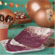 This wedding plate has a glamourous vintage theme, with a burgundy coloured, velvet style background and watercolor roses with glitter accents. Romantic blush coloured roses are pictured with ink patterns and glam faux gold glitter accents. String lights accent the flowers at the top.