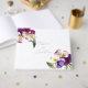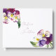 This romantic wedding guestbook features a floral design. The background is a simple and elegant white with purple watercolor violets. A delicate bouquet of violet flowers is picture in the top left, with the names of the couple printed below.