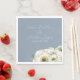 These romantic floral napkins feature an elegant dusty blue background with watercolor ranunculus flowers. A delicate bouquet of ranunculus and greenery is pictured on the bottom. Sample names of a newlywed couple and wedding date are printed above. You can personalize the napkins to include your own custom names or text.