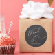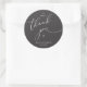 Modern Wedding minimalist Thank You Cookies Gifts Classic favors Round Sticker, in romantic script, little heart, with bride and groom signature and wedding date, charcoal grey theme.