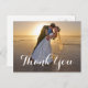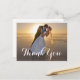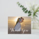 Share your gratitude in style with this romantic wedding thank-you card, featuring a stunning full-photo design of the bride and groom against a breathtaking beach sunset. The elegant script “Thank You” overlay adds a timeless touch, making it perfect for sending appreciation to guests, family, and friends after your special day. Easily personalize with your wedding photo to create a heartfelt keepsake that captures the love and beauty of your celebration. Ideal for beach weddings, destination weddings, or any couple wanting a picture-perfect way to say thanks.
