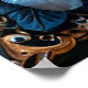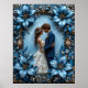 Beautiful wedding scene featuring a couple embracing in an ornately framed floral design with rich blue hues.