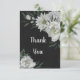 Unique wedding thank you card featuring romantic white flowers and green leaves on black background.