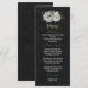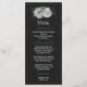 Unique wedding menu card featuring romantic white flowers and green leaves on black background.