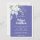 Create the perfect Wedding suite with this romantic and beautiful wedding invitation featuring a delicate watercolor bouquet with white gentle flowers, complemented with greenery and other botanical foliage on the left top corner, over a classy contemporary plain periwinkle purple background. Easily edit the template fields to add the bride and groom names in a classy white font, and your date and location details in a modern all-caps font. The back of the card is customizable with one of your favourite engagement pictures, complemented with an elegant white border.