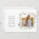 Elegant botanical wedding photo save the date with your best photo framed by bouquet of pristine white and ivory roses and gentle leaves over classic white background and