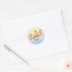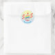 Sticker avec un gâteau souriant, arc-en-ciel qui porte un casquette de fête. Le dessin montre le nom de l’enfant d’anniversaire et un joyeux message d’anniversaire. Le texte peut être customisé.