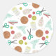 Un autocollant avec un motif à thème artisanal. Le design se compose d'une boule de fil avec aiguilles de tricot, boutons, ciseaux, une bouteille de parties scintillant, une bouteille de colle, ruban, et un pistolet à colle chaude. Le design a une palette de couleurs rétro orange, jaune, rouge et bleu/turquoise.