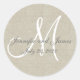 Elégant lin beige Monogramme Mariage rustique Favoriser Sticker ou Faire-part de mariage Envelope Seals. Entièrement Personnalisable. Elke Clarke©. Imprimé effet photo lin beige arrière - plan avec monogramme blanc et texte de script gris et blanc.