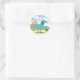 Bleu Dinosaure Dessin Nom Sticker. Un joli petit dessin animé de dinosaure bleu Parasaurolophus dans un paysage préhistorique lumineux en pierre avec palmier, montagnes et un vulcano avec étoiles de couleur dans le ciel bleu avec quelques nuages collant rond avec Votre Nom. Remplissez votre nom pour personnaliser vos autocollants spéciaux de dessin animé dinosaure avec votre nom ! Cet autocollant de dessin animé dinosaure est entièrement personnalisable, ajoutez votre(s) texte(s) et image(s). Super retour à l'école les stickers dinosaures ou cadeau d'anniversaire heureux autocollant pour les petits et grands fans de dino!