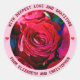 Un bouquet de fleurs roses fraîches de couleur rouge foncé ou marron. La beauté de la saison estivale, symbole de l'amour. Une peinture numérique à partir d'une photo. Un autocollant rond festif et coloré. Personnalisable . Vous pouvez changer deux images de rose et un coeur rouge et des notes musicales, et vous pouvez changer ou supprimer deux textes modèles : AVEC UN AMOUR ET UNE GRATITUDE PROFONDES et DE ELIZABETH ET CHRISTOPHER. Vous pouvez transférer ce design à une variété d'autres produits de votre choix. Veuillez utiliser le bouton "Modifier la conception" pour ajuster l'image à la forme du produit particulier. Il vous transmettra à l'outil de conception. Utilisez l'option "Remplir/Remplir" (menu à droite de l'outil de conception). Vous pouvez mettre à l'échelle, faire pivoter, retourner l'image sur le modèle du produit, et vous pouvez y ajouter du texte vous-même. Vous pouvez également modifier le type, la couleur, l'emplacement de la police et la couleur de l'arrière - plan en forme d'anneau. Soyez créatif, achetez-en un, amusez-vous et soyez heureux !
