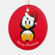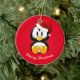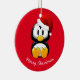 Ornement de Noël en forme ronde avec un arrière - plan rouge et un imprimé de pingouin de vacances mignon. Customisez cet objet ou achetez tel quel.