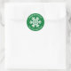 Un autocollant de flocon vert et blanc avec l'accueil, Fabriqué avec amour. Personnalisez-le avec votre nom de famille. Amusez-vous pour vos gâteries et cadeaux de Noël faits maison ou faits à la main. Conçu pour vous par Blackberry Boulevard.
