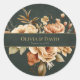 These round wedding stickers feature a deep forest green background with elegant beige florals, perfect for sealing envelopes, favor packaging, or wedding stationery. Designed to match forest witch and enchanted woodland wedding themes, they add a cohesive and magical finishing touch to your celebration. Ideal for invitations, thank you cards, and wedding favors.