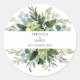 Elevate your wedding favors and stationery with these elegant, rustic circle stickers. Featuring a lush watercolor wreath of sage and emerald eucalyptus leaves, this design perfectly captures the 2025 trend of organic, garden-inspired celebrations.