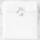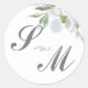 Scellez vos sacs de faveur ou enveloppes de faire-part de mariage botaniques avec ces élégants autocollants avec votre monogramme à la main typographie de script travaillé dans le design sur un arrière - plan blanc solide avec des fleurs bleues poussiéreuses et de la verdure. Vous pouvez même les utiliser comme étiquettes sur des ballons à lèvres pour des faveurs de douche nuptiale. Conçu pour correspondre à ma collection d'invitation à l'aquarelle fleurie et verte. Pour en savoir plus sur la papeterie mariage, visitez www.zazzle.com/vginvites
