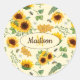 Nom personnalisable et autocollant monogramme avec imprimé de tournesols de jardin peints, peigne de miel, abeilles, couleurs jaune, marron et vert.