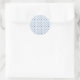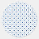 Round sticker design featuring a blue and white geometric pattern with diamonds and floral motifs. Below, a sheet shows multiple identical stickers.