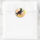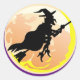 Silhouette noire d'une sorcière qui s'envole dans le ciel sur son balai pris dans la lueur de la nuit d'Halloween. Un autocollant parfait à utiliser pour vos cartes d'Halloween, invitations et sacs cadeaux de fête.