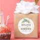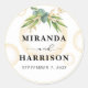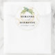 Beau autocollant mariage avec vos noms et votre date couplé avec des sphères d'or et un design botanique feuille verte - parfait pour ajouter aux enveloppes d'invitation et plus encore.
