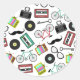 Un autocollant avec un motif hipster composé d'illustrations de bicyclettes, de lunettes, de cassettes, de disques vinyles, de squelettes, de moustaches, d'appareils photo et de télévisions à antenne rétro.