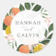 Scellez vos enveloppes d'invitation ou vos faveurs avec ces stickers de mariage classique d'agrumes. Avec ses noms encadrés par une couronne d'aquarelle de verdure, oranges et citrons. Coordonne avec la collection Citrus Love trouvée dans la boutique Adore Paper Co. Zazzle.