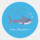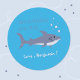 Un autocollant bleu mignon pour la fête d'anniversaire d'un enfant avec un dessin animé de requin nageant. Personnalisez-le avec votre texte et le nom de votre enfant. © ArianeC Illustrations-Tous droits réservés