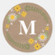Un autocollant qui présente une illustration de marguerites, de susans aux yeux noirs et de verdure. Personnalisez avec l'initiale au centre. L'Arrière - plan est d'inspiration papier brun. Recherchez des invitations de mariage assorties et plus encore chez Jill's Paperie.