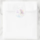 Sticker Classic Round Anniversaire avec une adorable licorne avec ailes, qui est entouré de photos mignonnes d'un château magique, des nuages et des bruits festifs.