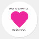Dans un monde à rythme rapide plein de bruit, cet autocollant nous rappelle doucement ce qui compte vraiment. "L'amour est beau" nous rappelle que l'amour, sous toutes ses formes, est la partie la plus précieuse de l'être humain. Elle se retrouve dans les relations, la gentillesse, la créativité et même l’autosoin. "Soyez reconnaissants" encourage l'esprit et la présence, nous aidant à trouver de la joie dans les petites choses : un sourire, un lever de soleil, un mot gentil, ou un moment tranquille.