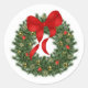 Couronne de pin avec ornements or, lumières rouges et arc rouge. Plutôt décorer vos cadeaux.