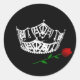 Autocollant rond en noir avec une empreinte litho d'une couronne de reine au concours et d'une rose rouge. Customisez cet objet ou achetez tel quel.