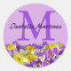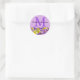 Un autocollant rond violet clair est décoré d'un gros monogramme de capital dans violet moyen. Le nom de la personne est écrit dans le majuscule M dans un joli script, qui est un violet très foncé. Les fleurs de printemps créent une belle bordure du fond. Il est composé de jonquilles jaunes et de crocus violets avec une touche de blanc.