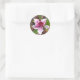 Une photo d'une fleur rose remplit cet autocollant rond. Le Merci est écrit en noir sur l'autocollant.
