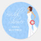 Un autocollant de douche nuptiale pour la mariée moderne. Une mariée royale se dresse contre un arrière - plan vintage à motifs floraux bleu clair. Utilisez-le sur vos invitations, cartes de voeux ou pour sceller des sacs de faveur. Disponible en couleurs alternatives. Contactez-moi si vous cherchez une autre combinaison de couleurs et/ou une autre mariée. Invitations et affranchissement correspondants disponibles.