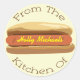 Un autocollant avec l'illustration d'un hot-dog dans un biberon. Personnalisez avec votre nom en jaune comme la moutarde. Texte autour de l'autocollant : "De la cuisine de".