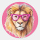 Le Lion aux lunettes roses sur l'arrière - plan rose. C'est un autocollant pour les amateurs de lions.